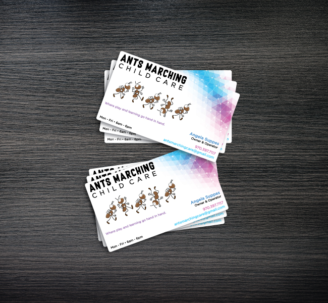 Once the business name had been established, I started work on the logo by laying out the text and working through a number of font choices before settling on the combination of Gotham and Supersonic Rocketship. Work then shifted to creating a simple, easily identifiable vector 'ant' that could be reproduced and easily modified to look like a line of marching ants. Initially both red and black color variants of the ants were tested, but my wife and I both felt that it didn't fit the cartoon feel of the ants, so I changed the color to a neutral brown.The client approached me to create a logo and business cards for her after seeing the work I had done for Ants Marching Child Care. I was given free creative direction over the project, with only a small handful of requests for the finished design: