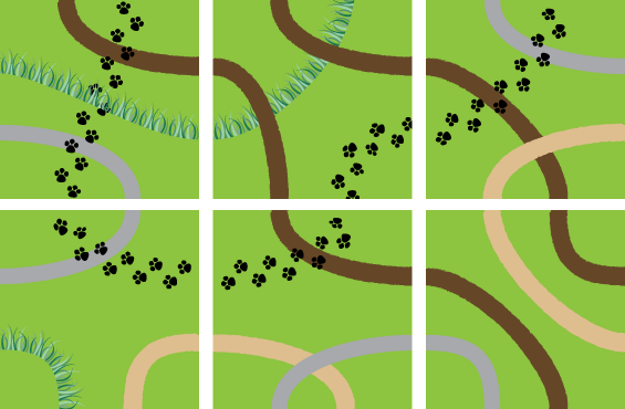With dogs, and specifically a dog park, as the theme for the game, I set about creating the variations for all 36 tiles with things that can be found in a dog park. Each tile is built on a grass green base, while the paths on the tiles are made up of sidewalks, dirt, sand, paw prints, and overgrown grass edges.Send me some information about how you see us working together.