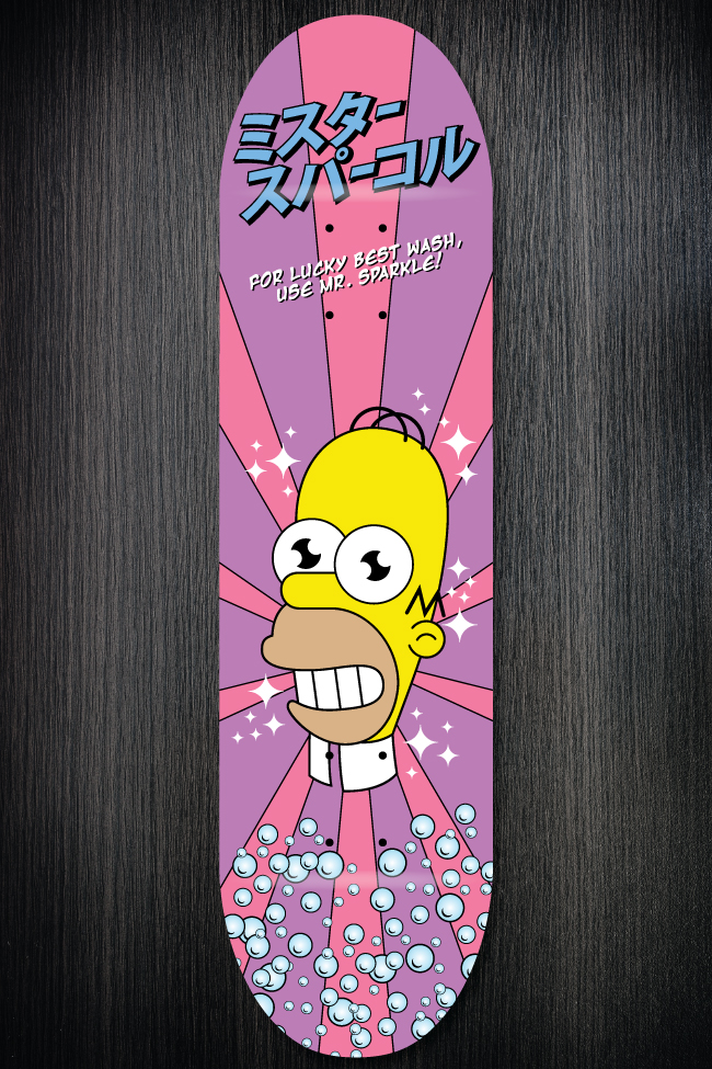 The idea for this skateboard actually started back when I was in the beginning stages of my design degree, learning the fundamentals of Adobe Illustrator. We were working through a lesson on what our instructor called "Base Black" drawing, where every piece of art starts with a black base, and every compositing piece is built on top of it until you reach your completed piece of art. After going through the lesson, we were tasked with using what we had just learned to create a personal project. I'd been binge watching The Simpsons at the time, and had recently seen the episode In Marge We Trust, and the idea of using the base black process to recreate the Mr. Sparkle soap box from the episode seemed hilarious to me. While I don't recall what grade I got on the project all these years later, I do remember printing the recreated design out and taking it with me from job to job, always posting on the wall next my desk.