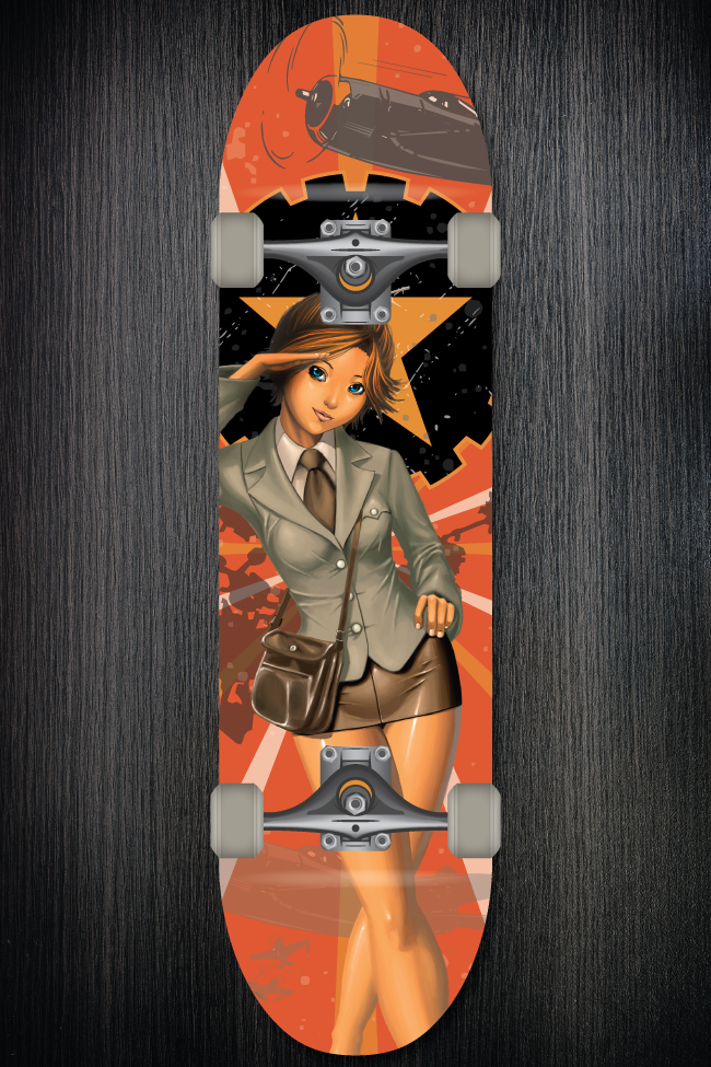 For the text I tried to keep things similar to the art and use fonts that had a simple art-deco inspired feel to them. In the end, the whole thing felt a bit too monotonous, so I substituted in some script fonts, and a much heavier "eroded" font for the emphasized numbers (the toddler's age and date of the party). After making these substitutions, the proof was sent off to the client.There's something amazing to me about the idea of designs that are meant to be destroyed. While the vast majority of the design world is propped up on creating designs that can stand the test of time, skateboard graphics are unique in that they're meant to be disposable flashes of brilliance.